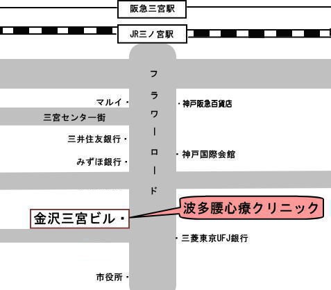 ・「さんちか」より神戸市役所手前C1出口をめざして地下道を進んでください。雨に濡れずにお越しいただけます。車いすでもOK。すぐ向かいはフラワー薬局です。